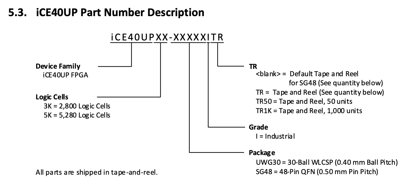 The UPduino v3.1 is developed by tinyvision.ai and designed around a Lattice Semiconductor UP5K field programmable gate array (FPGA). Section 5.3 of the iCE40 UltraPlus Family Data Sheet (FPGA-DS-02008-2.0) explains the naming of the chip.