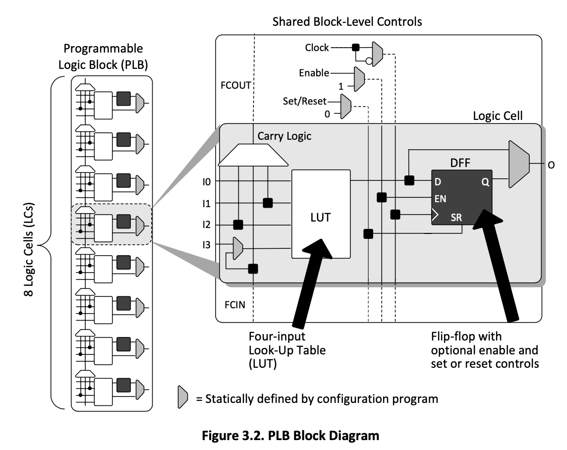 The Lattice UP5K is very similar to the Cyclone IV architecture that is used to introduce FPGAs in E85. At its root, the FPGA consists of Logic Cells (Lattice’s version of the Intel/Altera Logic Elements you learned about in E85) which can be internally connected within Programmable Logic Blocks (PLBs) within the FPGA to form digital circuits. Each Logic Cell (LC) consists of a 4-input look-up table (LUT) and a programmable D flip-flop, along with additional clock control and carry logic. Figure 3.2 from the FPGA datasheet shows the basic architecture of a PLB and LC.